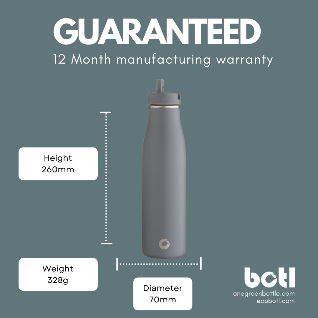 One Green Bottles Evolution bottle is a Stainless steel vacuum insulated isothermal water bottle. Luxe bottles designed to keep your beverage cool for 24hrs or hot for 12hrs. CAUTION: Do Not use boiling water. We recommend 80c max and advise to open with care when using hot water.