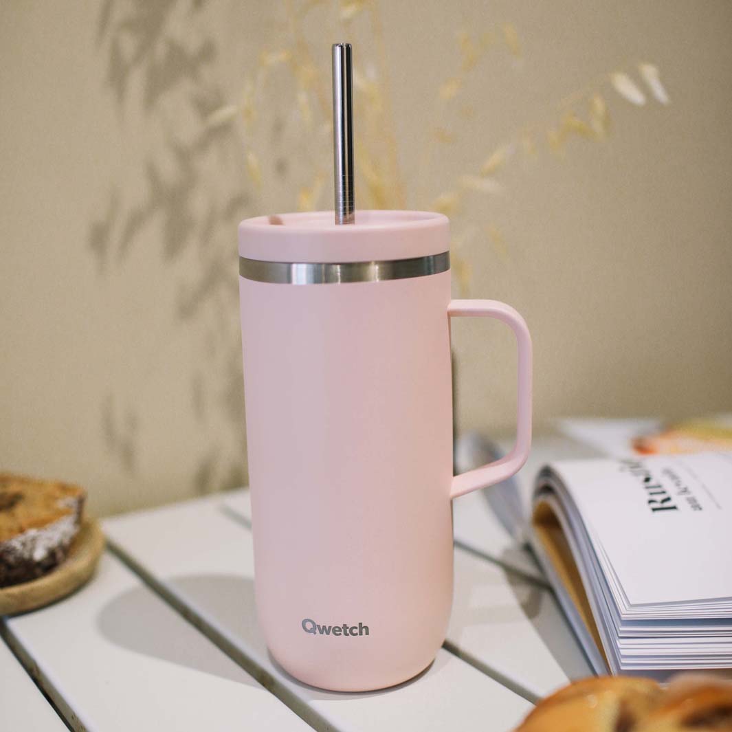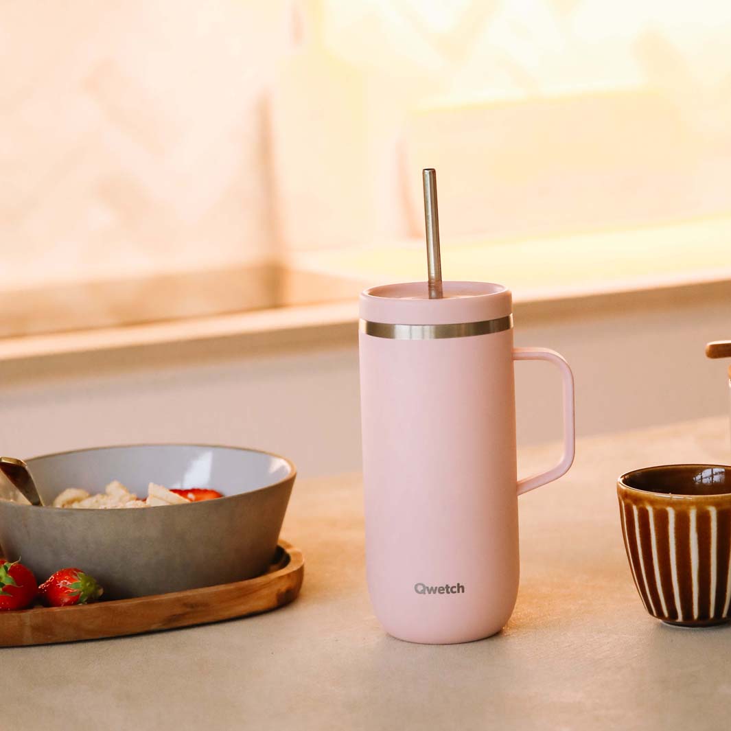 Pink insulated mug with a straw on a white background | Little Twidlets