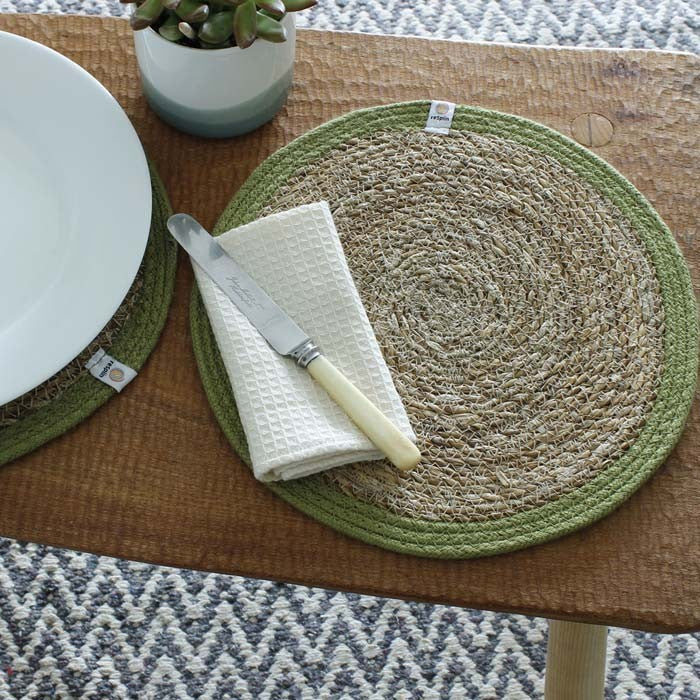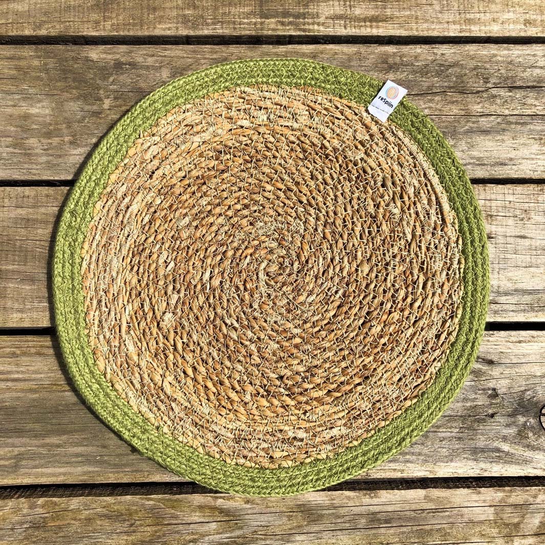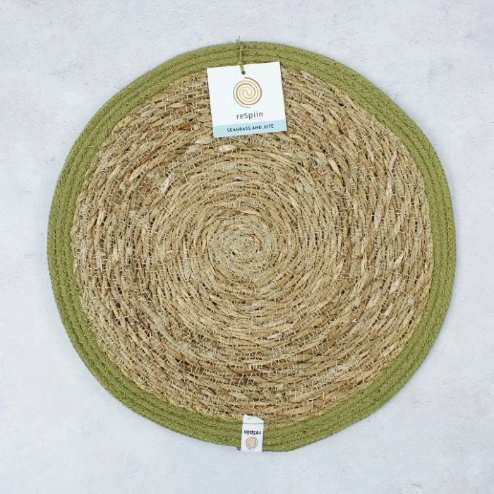 Made from sustainably sourced seagrass and jute. Coloured with non-toxic dyes and tested safe for food contact. Each mat has a small fabric ReSpiin label stitched onto the edge.